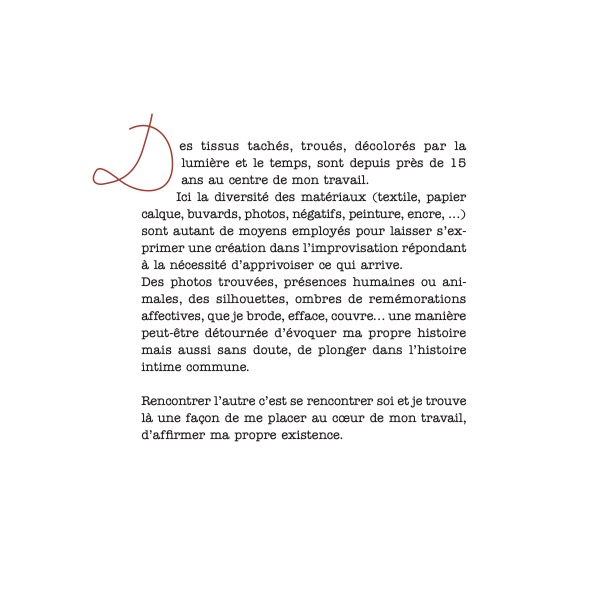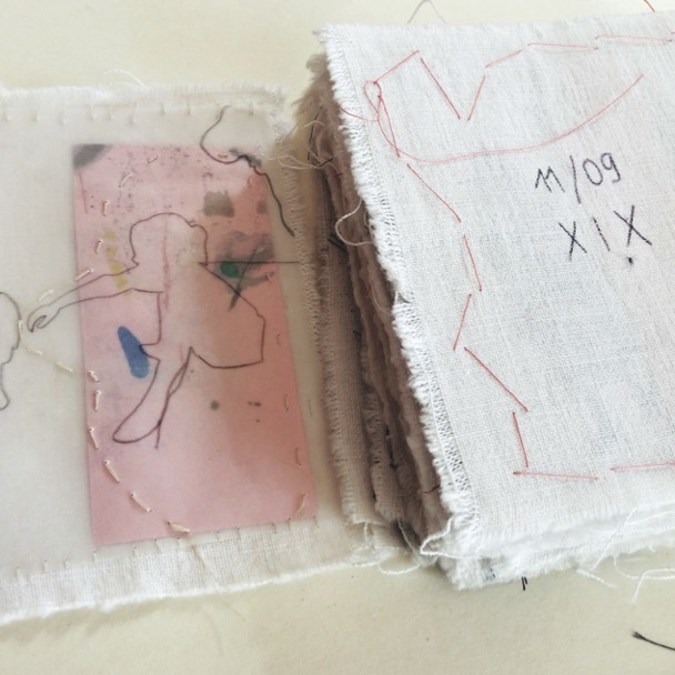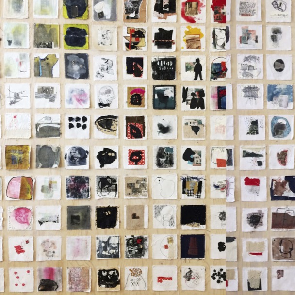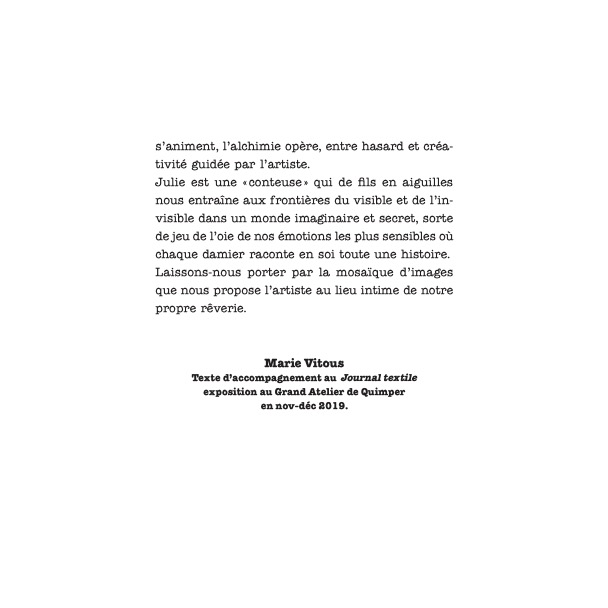 J’ai toujours tenu un journal, noirci des carnets…En 2019 j’ai tenu un journal textile où chaque jour pendant un an j’ai créé une image sur un carré de coton blanc. Tissus, fils, papier, peinture, encre, … la diversité des matériaux sont autant de moyens employés pour laisser s’exprimer une création dans l’improvisation.